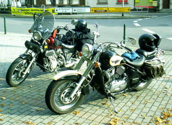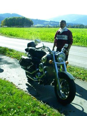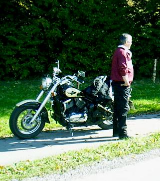 Mein Hang zum Gegenlicht - Dokumentation der gnadenlosen Sonne, die auf uns brennt - lässt Charly hier etwas dunkel neben seiner Dicken stehen, aber sein guter Wille zur bikenden Lichtgestalt ist doch gut zu erkennen.