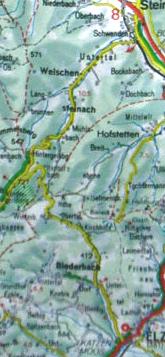 biegen kurz vorher jedoch links Rtg. Biedenbach in die 3. Landschaftsetappe: die Strasse führt nur langsam bergan, bietet aber im oberen Verlauf wieder muntere Kurven, nach einer weiten Serpentine geht es rechts Rtg.Steinach und wieder folgt ein wildkurviges Stück nach Welschensteinach hinunter, in dessen engen Kurven wir endgültig das uns folgende Moppedpärchen, das vorher in den weiten Kurven gut mithielt - im Rückspiegel verlieren. |