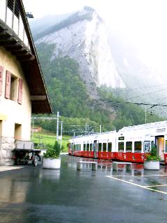 Insgesamt jedenfalls kommen wir erst deutlich verspätet durch Martigny und wunderten uns - hochsommerverwöhnt über die vielen nassen Motorradfahrer, die uns entgegenkamen, bis wir zum Ortsausgang hin die nasse Strasse entdeckten und über den Ortsausgang hinaus das beginnende Nieseln und die tiefgraue Wolkenwand in die Berge hinein, das wir beschlossen zu ignorieren, da wir hier kein - unserer Ansicht nach - günstiges Quartier finden konnten.