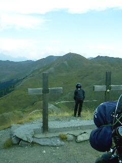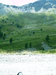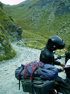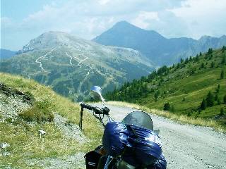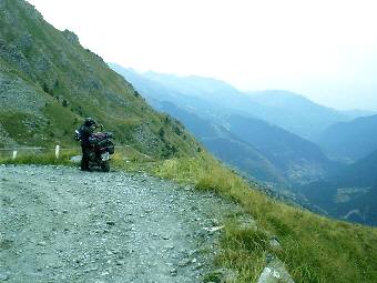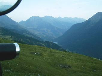 Dort erst einmal Proviant aufgefrischt, gefrühstückt und - endlich kein reiner Blindflug mehr - die guten Michelinkarten (Local - 1:150.000), drei an der Zahl, erstanden. Jetzt kann eigentlich nichts mehr schief gehen. Hinaus geht es Richtung Claviere und über den Col de Montgenevre. Im Anstieg bleibt Montgenevre im Tal unter uns liegen, leider habe ich nur wenig Möglichkeiten den Ausblick zu geniessen und manchmal beneide ich Lollo um ihren Soziasitz. |