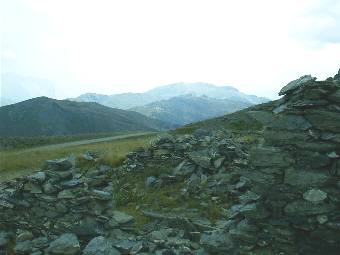 Am Mt.Genervis liegen Pietro Ploti und Mario Costa begraben.Man mag nicht neidisch sein auf ihren Tod, aber die Grabstätte in dieser wundervollen Bergwelt ist schon einzigartig. Im Hintergrund ist winzig das schmale Strässchen erkennbar das weiter zum Colle Blegier führt. |