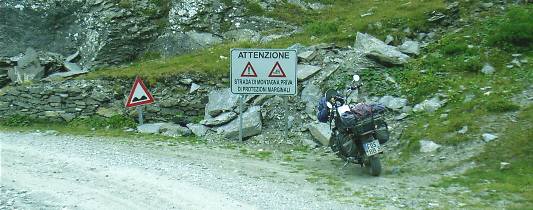 Bei Claviere habe ich auf der Michelin-Karte eine "gefährliche oder schwierige" Strasse entdeckt und versuche mich ihr unauffällig zu nähern. Der erste Versuch - via der ersten Abfahrt Cesana Torinese - geht schief, obwohl das Anliegersträsschen in ein hübsches Schotterwegchen mündet mit einigen tiefen Kiesriefen, die ich schlingernd überwinde, sieht es nicht danach aus, als hätte ich den Aufstieg erwischt. So schliesse ich mich dem Protest meiner Sozia an und kurve zurück, es muss wohl der unscheinbare Abzweig zwischen den beiden weiten Kehren gewesen sein, ein anderer Weg kommt jetzt nicht mehr in Frage. Kaum zurück geht es über ein schmäler und holperiger werdendes Schottersträsschen geradezu rasend schnell bergauf.