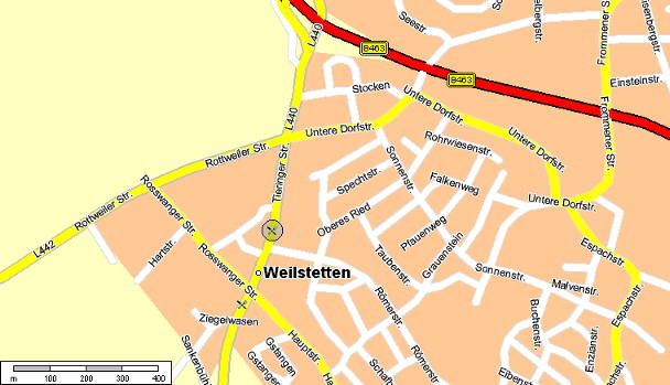 Die Alte Säge (s.Gaststättensymbol im Kreis) liegt rechter Hand an der Tieringer Strasse (Durchfahrtsstrasse von Weilstetten in Richtung Lochen s.braunes Landschaftsschild), dem Moppedfahrerhausberg von Weilstetten. |