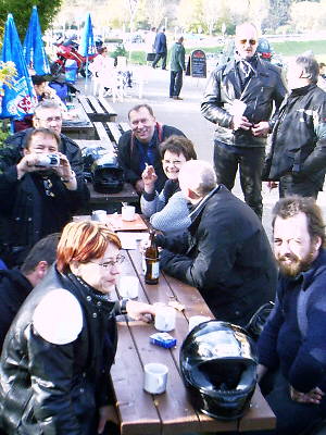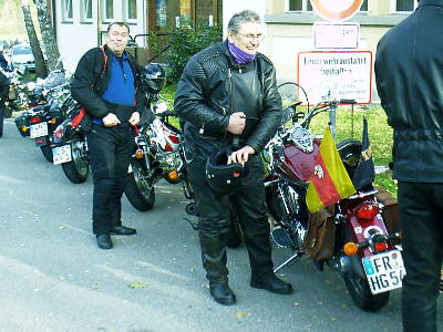Stefan, endlich und allein angekommen, nachdem Captain60 mit Motorschaden liegen blieb, schält sich aus Halbschale und Ledermantel. (Das muss frisch gewesen sein.) |