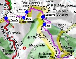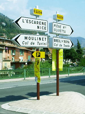 Ich fahre über die Küstenstrasse bis nach Ventimiglia und folge der Beschilderung Colle di Tenda, die man freundlicherweise bereits hier angebracht hat. In Tende bereite ich mich gewissenhaft auf meine bevorstehende Expedition vor: ich tanke schnell voll, kaufe 1,5 L Trinkwasser und beginne mit dem Anstieg zum Col und oben am Tunnel schliesslich zu grübeln, wo denn wohl die Strasse hinauf sich befinde? Nach Kartenanalyse komme ich zum Schluss, der Abzweig müsse wohl in der letzten Serpentine liegen. Und tatsächlich, kaum zurück und abgebogen, stosse ich auf einen unscheinbaren Wegweiser und den Beginn der Schotterstrecke, die sich in geradezu endlosen, teilweise reichlich engen Serpentinen den Hang hinaufwindet. |