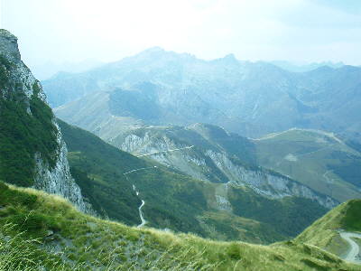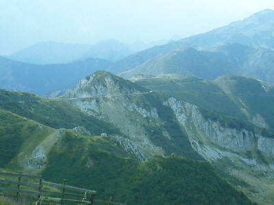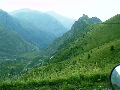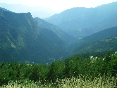 Tende liegt weit unten und unsichtbar im Tal, lediglich ein kurzes Stück der zum Tunnel führenden Strasse ist noch sichtbar. |