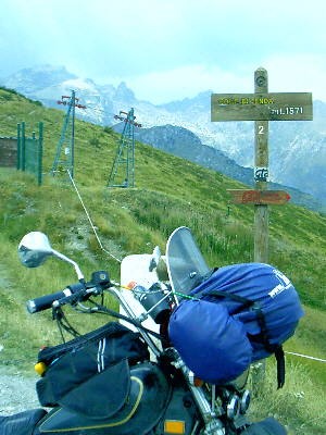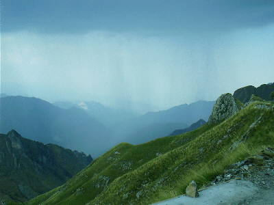 | Auf dem Weg zum Colle de la Perle (2086m) fängt es an zu tröpfeln, ich zerre die Regentasche vom Windschild, es tröpfelt heftiger, ich stelle fest, dass die vorausgegangenen Schauer der Tour nicht niederschlagsfrei am Inhalt vorbeigeangen sind, beschliesse aber nach kurzem Zögern, dass moderate Nässe innen noch immer brachialer Nässe aussen vorzuziehen ist und zwänge mich in die bereits gut eingenässte Regenkombi. |