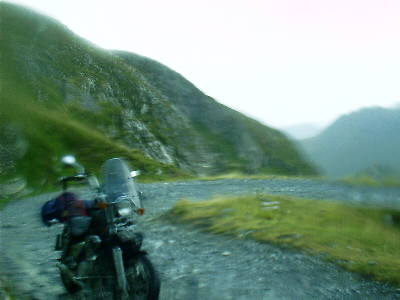 Die mutmasslich allerheftigsten Stellen überwinde ich nur als Vierfüssler, mehrfach 5-10 m weit manöveriere ich Hoizkessele mit Schritttempo und gas- und fussunterstützt von Stufe zu Stufe. Jeder Wanderer ist an solch einer Stelle schneller. Warum kreisen eigentlich meine Gedanken beständig um Scott? Ein Pärchen Radfahrer sucht Schutz unter einem Felsvorsprung, kaum gross genug für einen Menschen, nirgendwo findet sich eine ausreichend grosse Zufluchtstätte für mich nebst Motorrad. Also geht es weiter. Ein Endurofahrer kommt mir, gemessen an meinem eigenen Tempo, geradezu entgegengeprescht, nickt grinsend, was ich beschliesse als Aufmunterung zu verstehen, abzuwarten und zu lächeln. Natürlich wird der Weg nicht besser, geht bald aber immerhin wieder bergauf. Auf einem ebenen Stück neben dem Weg hat sich ein Grüppchen Autos zum Warten entschlossen, ich sehe, wie jemand hinter den angelaufenen Scheiben die Sitze runterkurbelt und sich mit einem Schlafsack zudeckt.