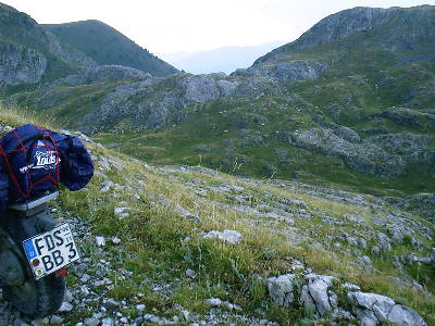 Am Col de Boaire (2102 m) geht es über rutschige Stufen, die meisten an der Grenze der Bodenfreiheit von Hoizkessele. Weil abwärts die Federung in die Knie geht, setze ich mehrmals heftig auf dem Hauptständer auf.